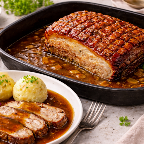 Krustenbraten aus dem Backofen mit brauner Soße